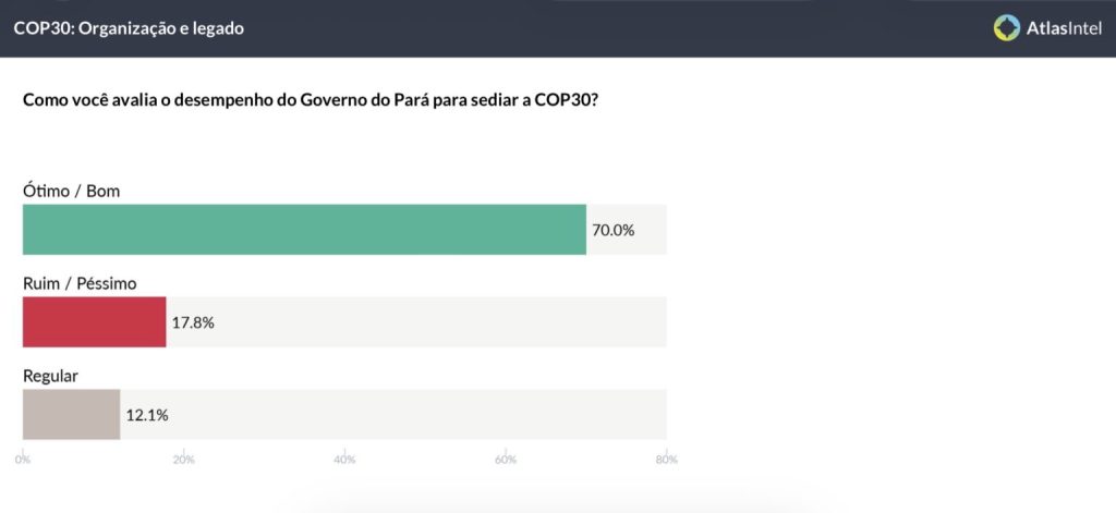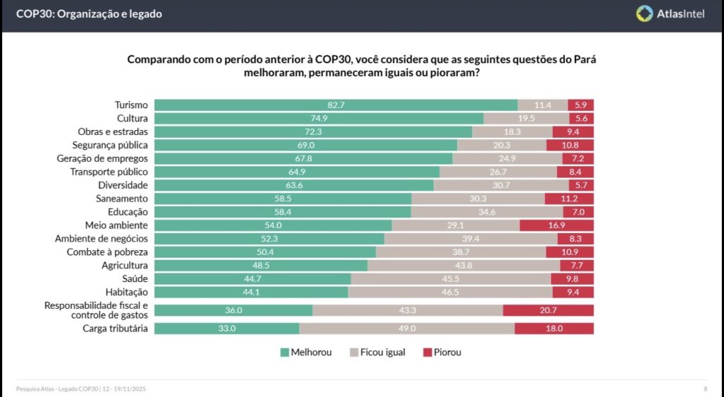 A pesquisa também revela confiança no impacto duradouro do evento: 72,6% dos entrevistados acreditam que os investimentos federais e estaduais deixarão um legado positivo para o Pará após a conferência. Para a maioria, a melhoria da infraestrutura, a dinamização econômica e a projeção internacional do estado são fatores que reforçam essa expectativa.