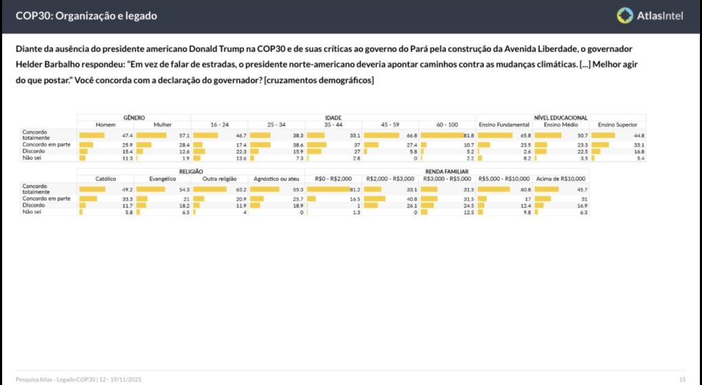 A pesquisa também abordou um ponto de opinião política específica, relacionado à recente polêmica envolvendo a crítica do presidente americano Donald Trump à construção da Avenida Liberdade, em Belém. Os paraenses foram questionados se concordavam com a resposta do governador Helder Barbalho, que afirmou: “Em vez de falar de estradas, o presidente norte-americano deveria apontar caminhos contra as mudanças climáticas. […] Melhor agir do que postar”. O tema foi incluído como forma de medir a percepção pública quanto às tensões políticas internacionais ligadas à pauta ambiental.